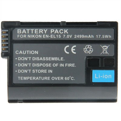 1) Type de cellules: EN-EL15 2) Capacite: 2499mAh / 17.5Wh 3) Output Voltage: 7.0V 4) Modele d'appareil photo compatible: NIKON D7000 / D800 / D600 / V1 5) Poids:74g